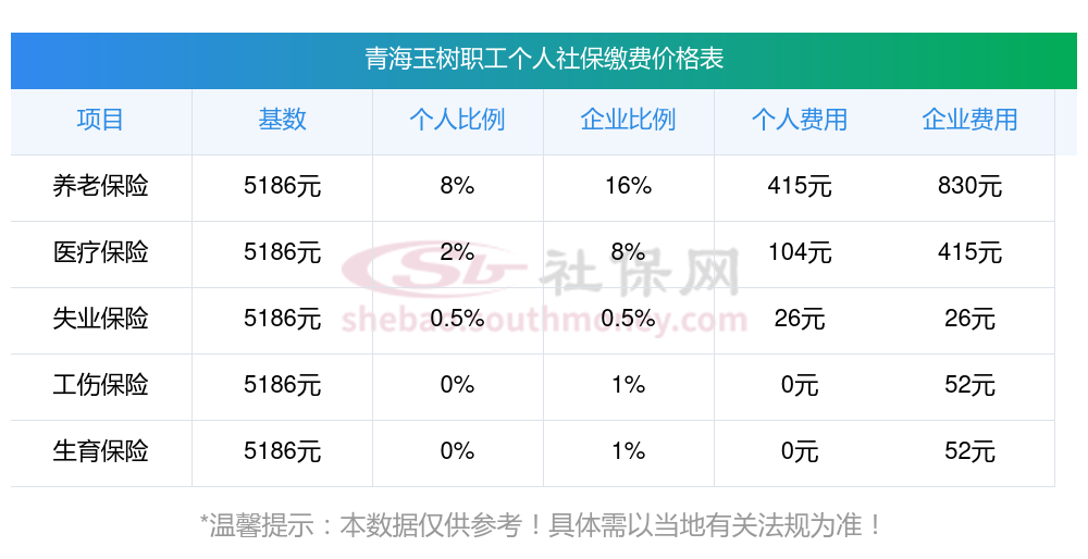 2025年青海玉树5险缴费标准,2025年青海玉树社保缴费多少钱?下表是2025年青海玉树社保费用明细参考,新社通app-社保缴费查询工具提供的最新数据如下: