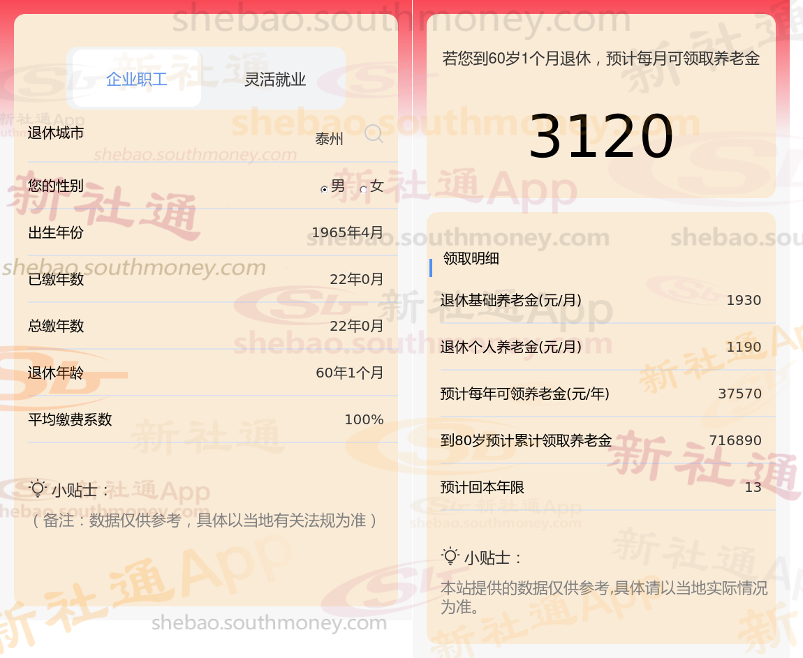 退休城市:泰州,性别:男,出生年份:1965,总缴年数22年,缴费档次:100%,新社通app养老金计算器所得: