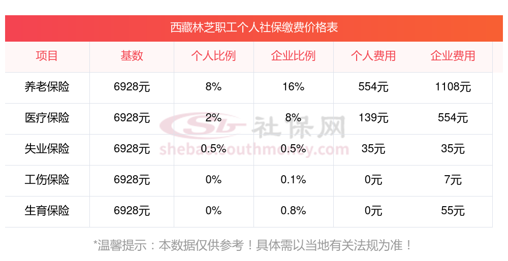 2025年西藏林芝社保缴费价格标准是多少,2025年西藏林芝社保缴费多少钱?下表是2025年西藏林芝社保费用明细参考,新社通app-社保缴费查询工具提供的最新数据如下: