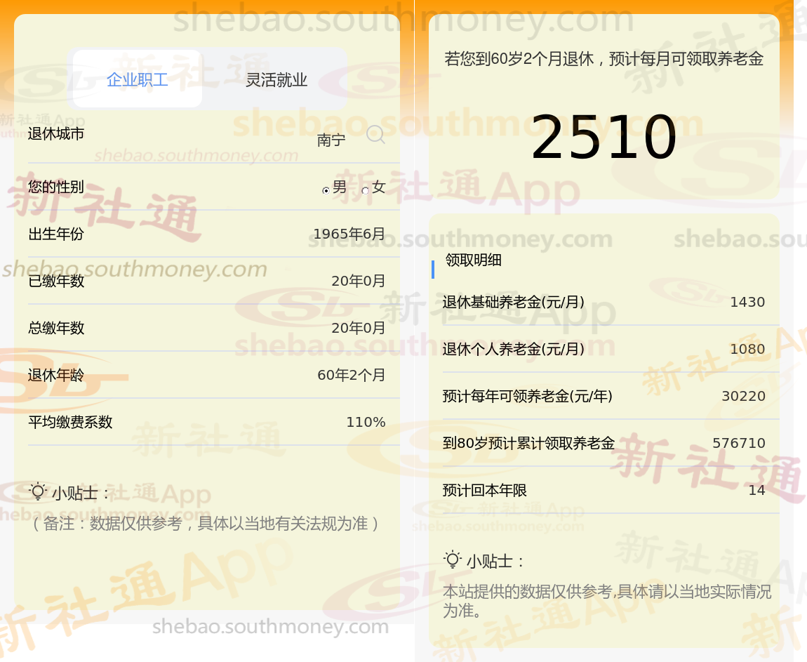 退休城市:南宁,性别:男,出生年份:1965,总缴年数20年,缴费档次:110%,新社通app养老金计算器所得: