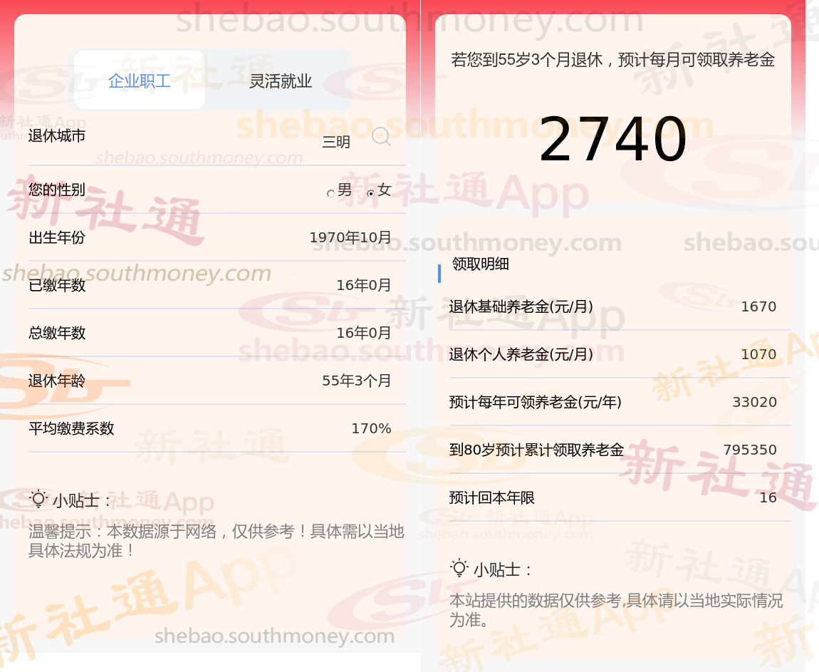 网友柯某退休城市在三明,性别:女,出生年份:1970,总缴年数16年,缴费档次:170%,新社通app养老金计算器所得: