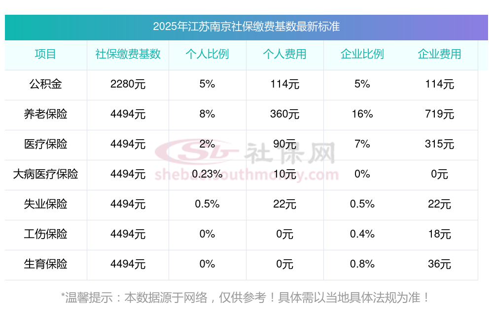 2025年江苏南京社保缴费最低基数及个人和单位具体是多少钱?下表是2025年江苏南京社保费用明细参考,新社通app-社保缴费查询工具提供的最新数据如下: