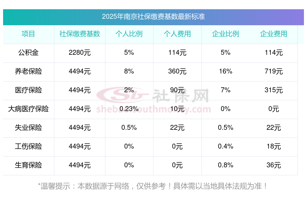 2025年南京5险缴费标准,2025年南京社保缴费多少钱?下表是2025年南京社保费用明细参考,新社通app-社保缴费查询工具提供的最新数据如下: