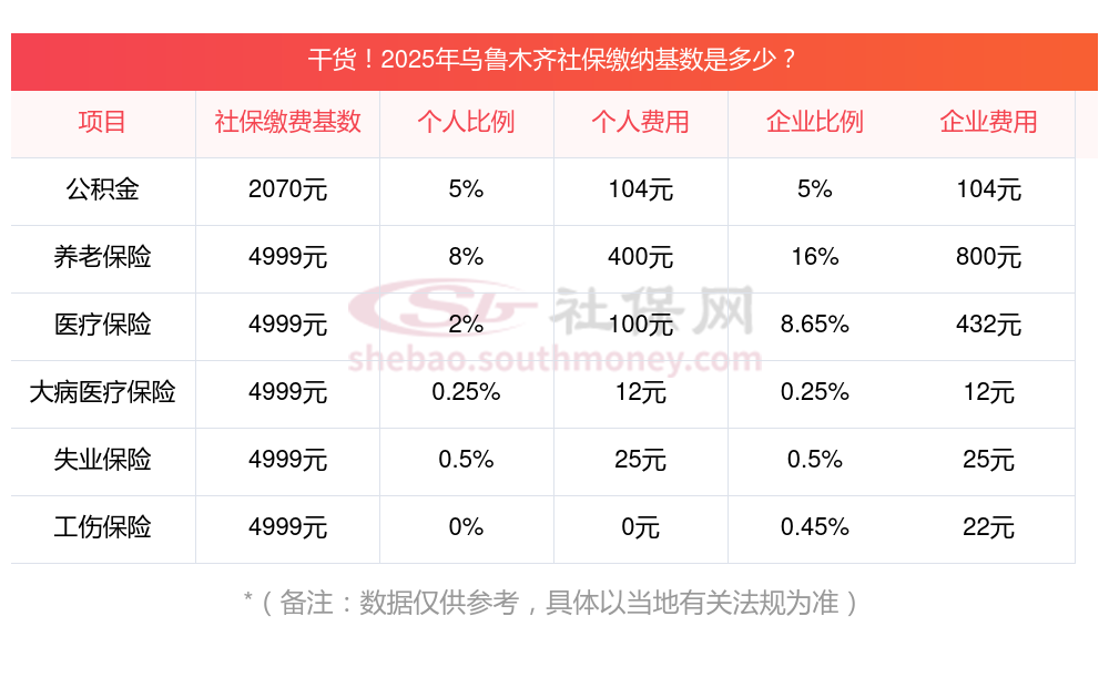 乌鲁木齐2025年养老保险缴费标准是多少?下表是2025年乌鲁木齐社保费用明细参考,新社通app-社保缴费查询工具提供的最新数据如下: