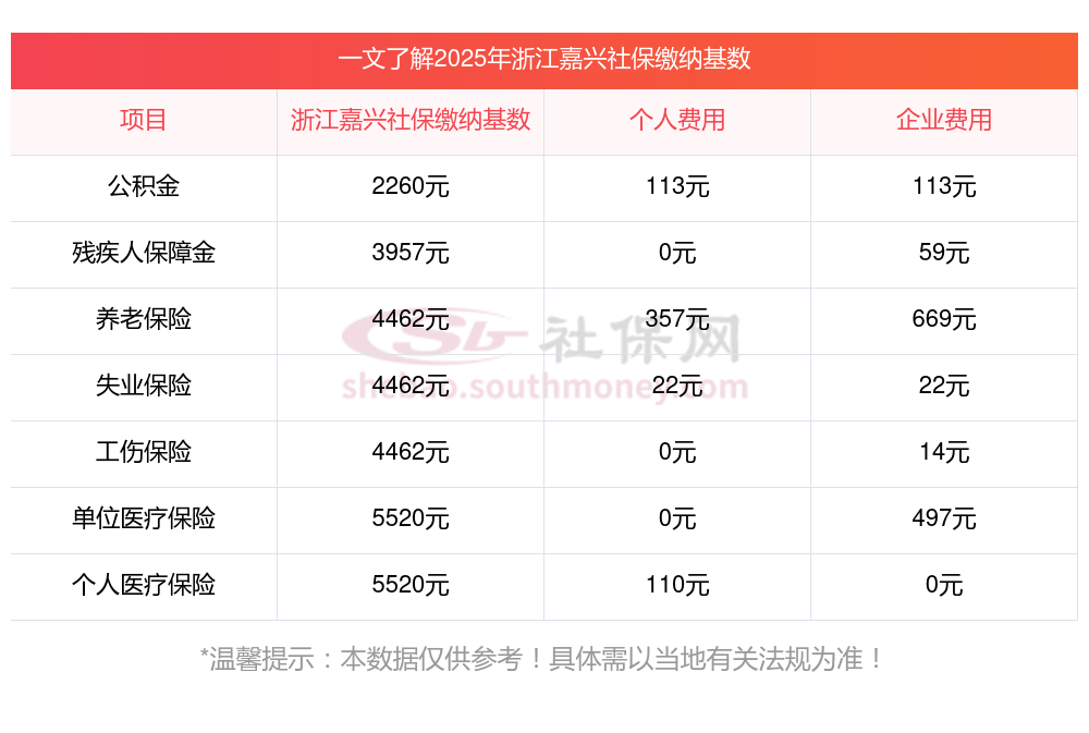 浙江嘉兴2025年养老保险缴费标准是多少?下表是2025年浙江嘉兴社保费用明细参考,新社通app-社保缴费查询工具提供的最新数据如下:
