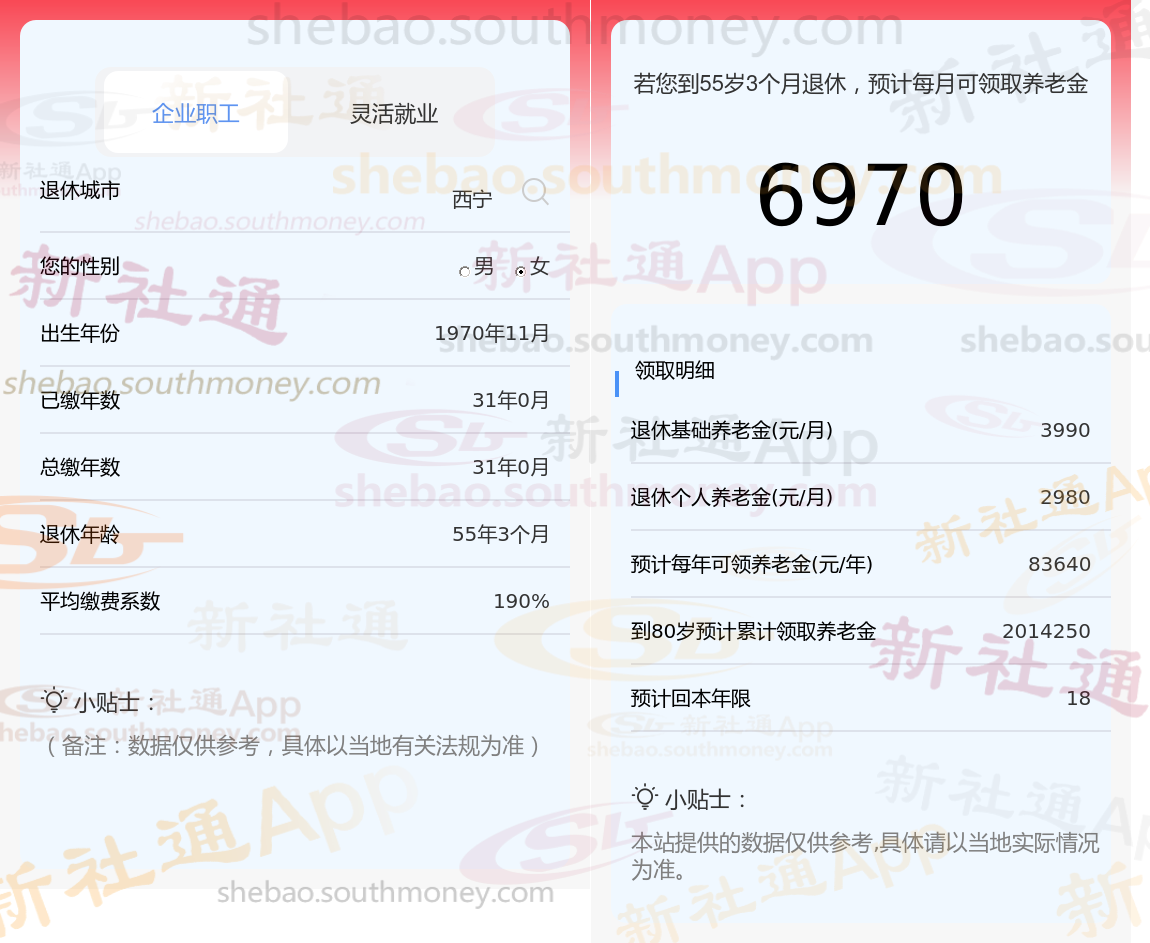 笔友沈某退休城市在青海西宁,性别:女,出生年份:1970,总缴年数31年,缴费档次:190%,新社通app养老金计算器所得: