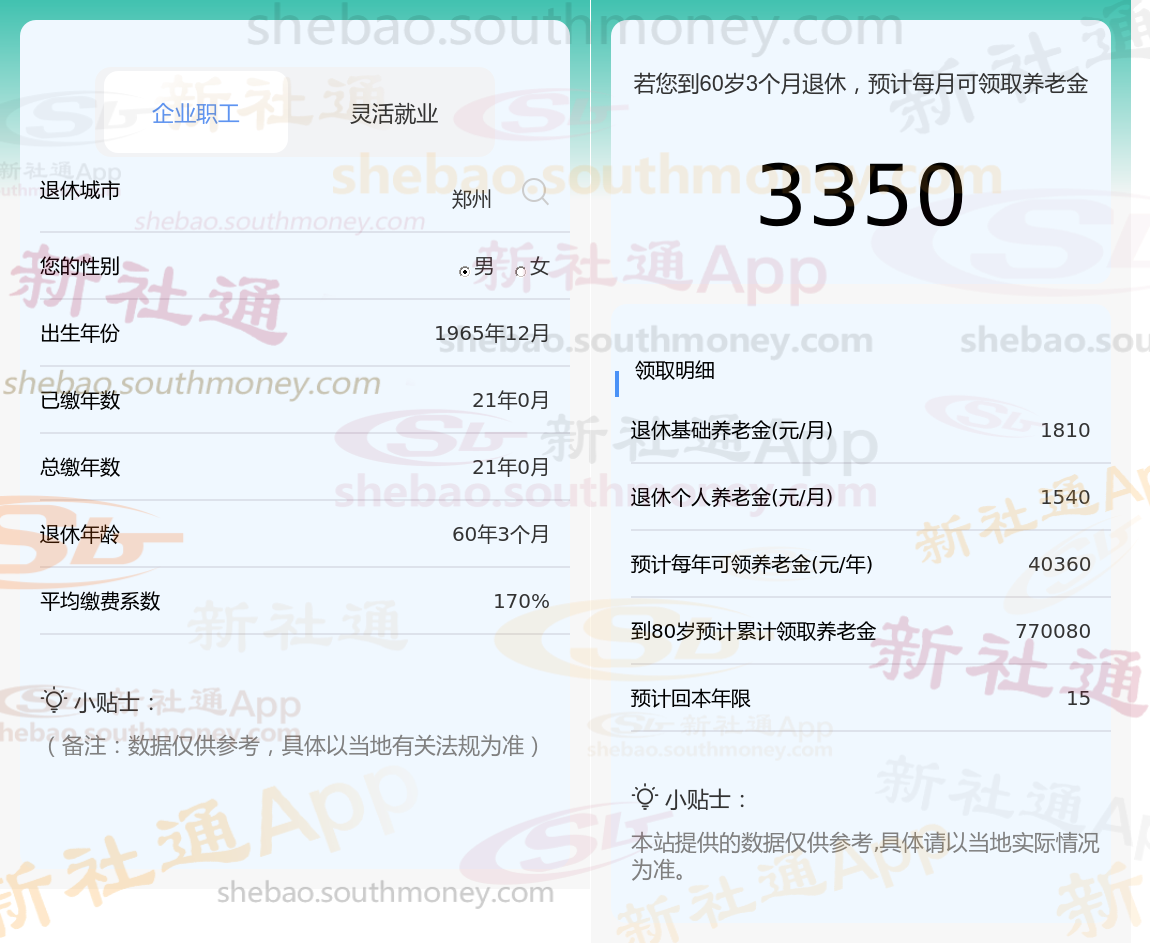 退休城市:郑州,性别:男,出生年份:1965,总缴年数21年,缴费档次:170%,新社通app养老金计算器所得: