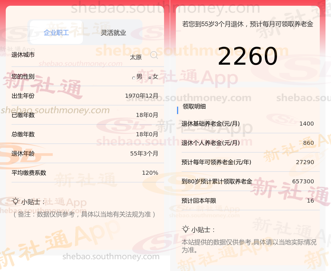 退休城市:太原,性别:女,出生年份:1970,总缴年数18年,缴费档次:120%,新社通app养老金计算器所得: