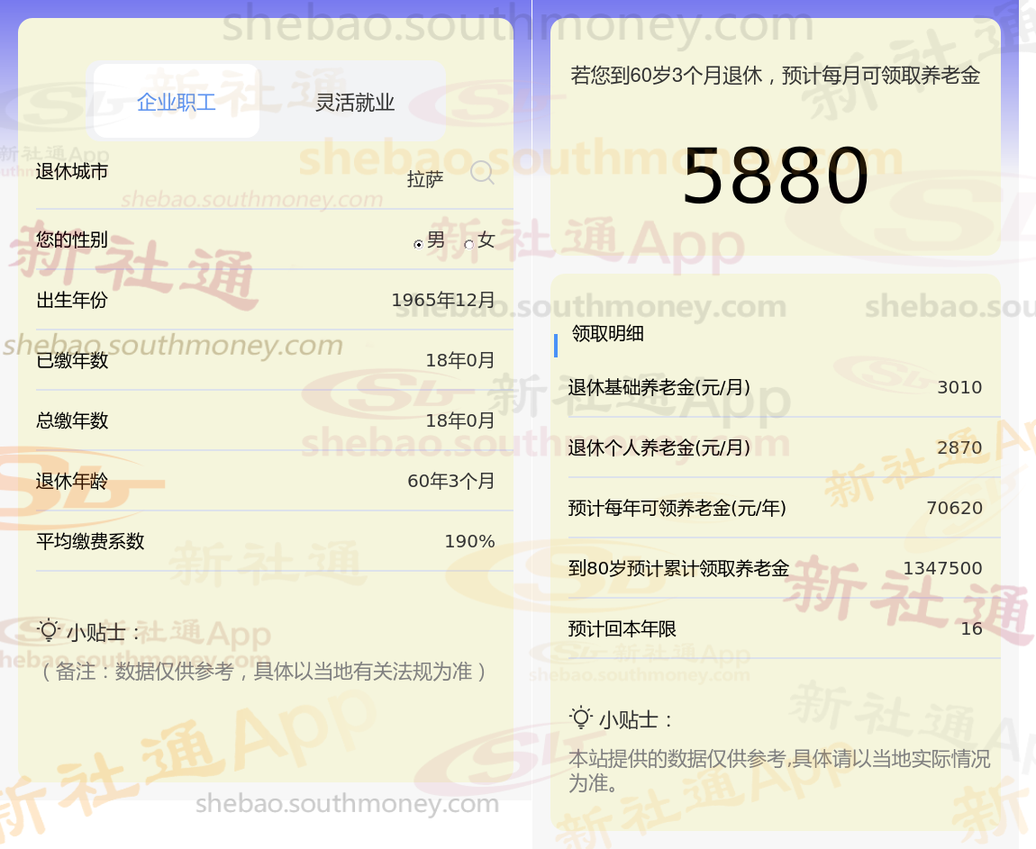 退休城市:拉萨,性别:男,出生年份:1965,总缴年数18年,缴费档次:190%,新社通app养老金计算器所得: