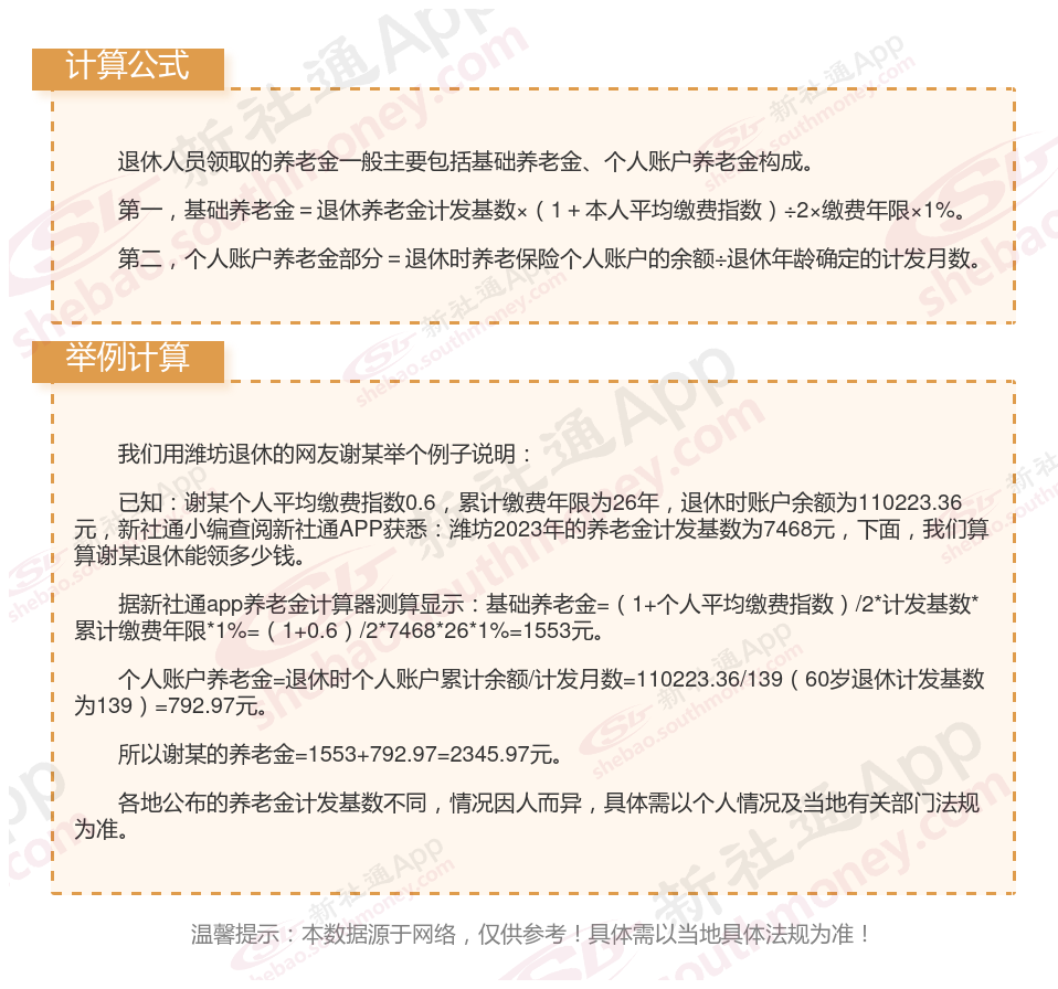 第一,基础养老金=退休养老金计发基数×(1+本人平均缴费指数)÷2×缴费年限×1%。