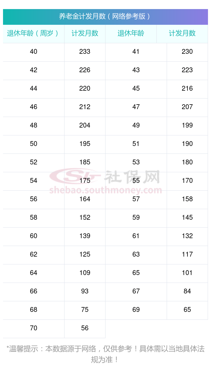 个人账户养老金=个人账户储存额÷计发月数(计发月数根据退休年龄和当时的人口平均寿命来确定。计发月数略等于(人口平均寿命-退休年龄)X12。目前50岁为195、55岁为170、60岁为139,不再统一是120了)