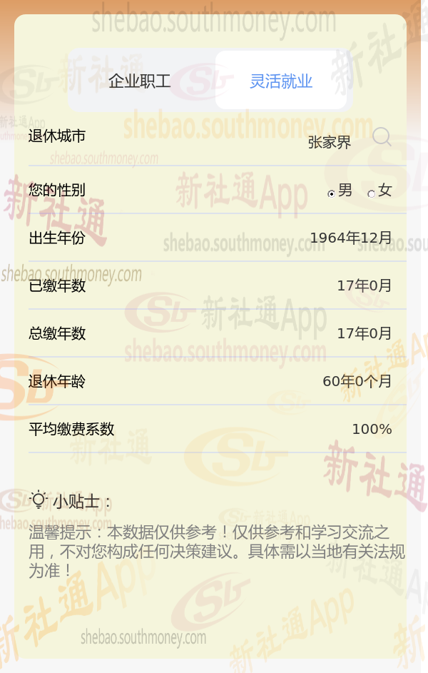 同事朱某退休城市在张家界,性别:男,出生年份:1964为例,假设其按最低标准(缴费系数0.6)缴纳社保,新社通app养老金计算器预设工资增长率等参数为3%。在此情境下,其退休后能领取的养老金数额需通过计算器精确得出,但基于上述条件,预计数额会相对较低。为获准确估算,建议朱某使用计算工具按要求输入个人信息进行计算,具体数额依个人情况及当地法规而定。