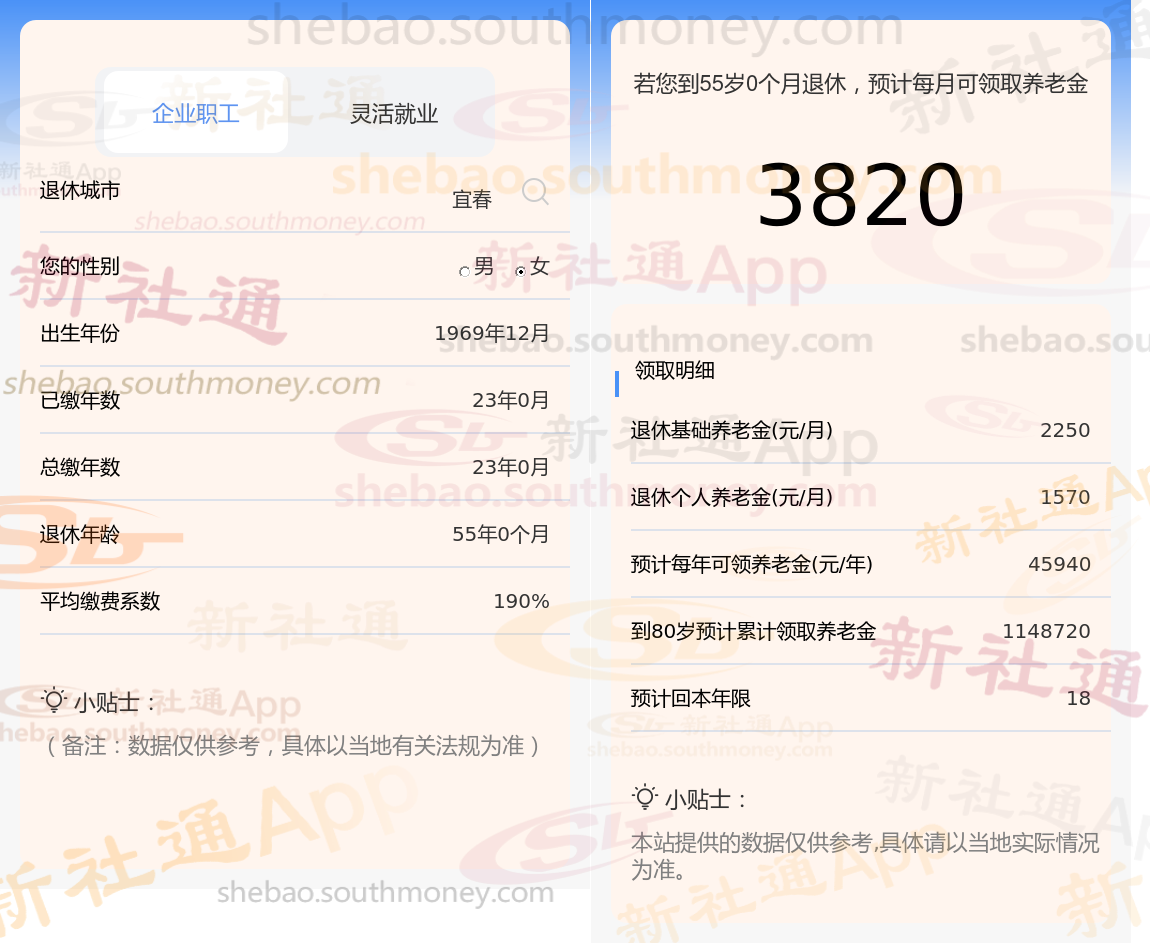 希某,拥有长达23年的养老保险缴纳年限,其缴费档次一直维持在较高的190%水平。基于这些详细信息,我们使用了新社通app养老金计算器,并参考了当前的养老保险法规,对他未来的养老金进行了如下估算: