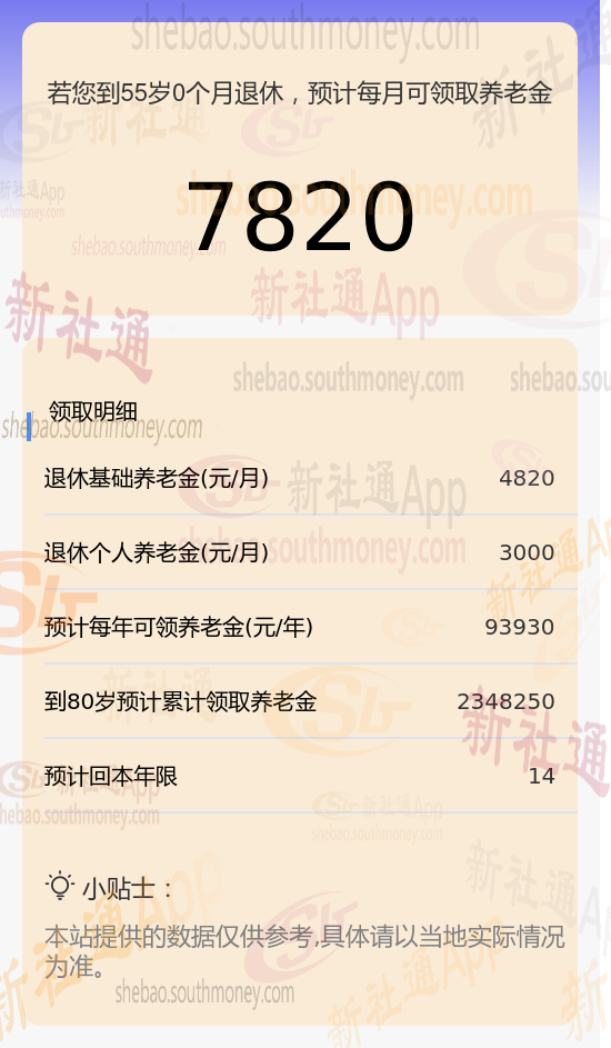 每月总共能领多少:把上面两个数加在一起,就是每个月你能领到的养老金总数啦,大概是7820元(即4820元基础养老金+3000元个人养老金)。