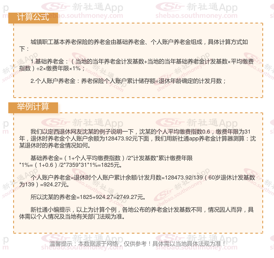 基础养老金=(养老金计发基数+养老金计发基数×平均缴费指数)÷2×累计缴费年限(含视同缴费年限)×1%;
