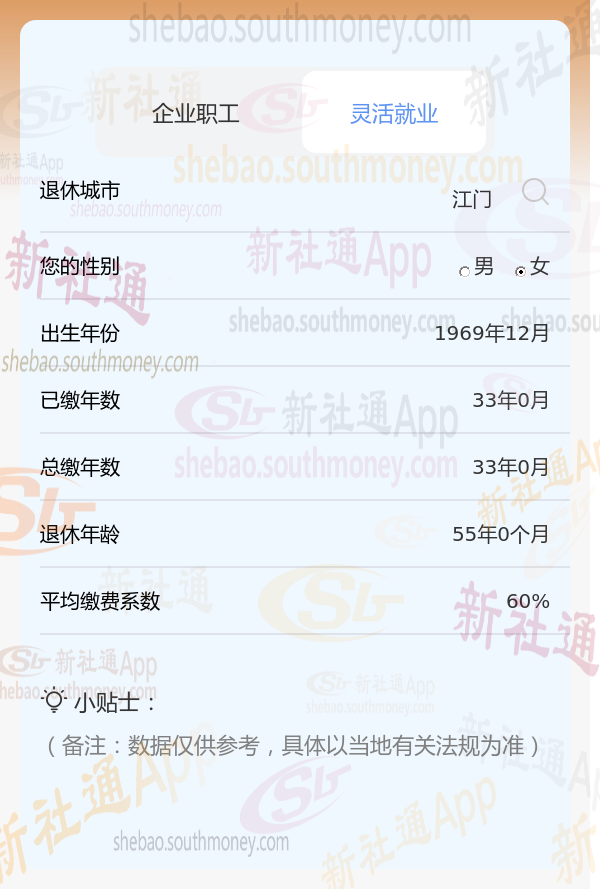 以江门1969年女性夏某为例,假设其按最低标准(缴费系数0.6)缴纳社保,新社通app养老金计算器预设工资增长率等参数为3%。在此情境下,其退休后能领取的养老金数额需通过计算器精确得出,但基于上述条件,预计数额会相对较低。为获准确估算,建议夏某使用计算工具按要求输入个人信息进行计算,具体数额依个人情况及当地法规而定。