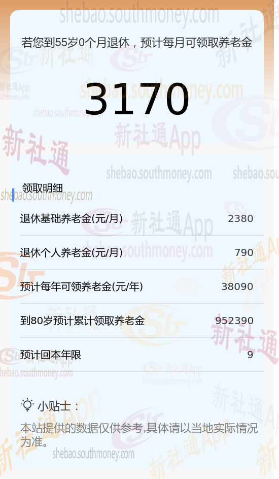 每月可领养老金=基础养老金+个人养老金≈2380+790≈3170元。