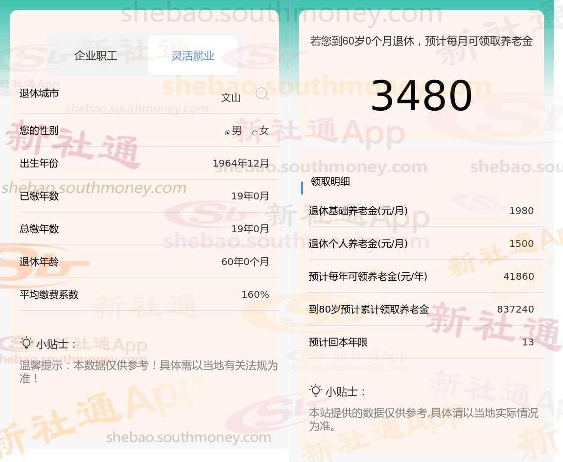 新社通app养老金计算器计算所得: