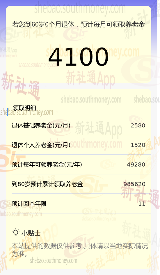 每月可领养老金总额:将基础养老金与个人养老金相加,每月可领取的养老金总额约为4100元(2580元+1520元)。