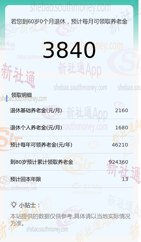 养老金总和:两者相加,每月养老金=2160元+1680元 ≈3840元/月。