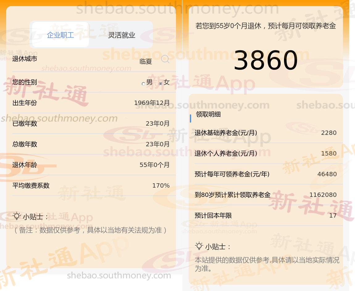 基础养老金估算:在综合考量各项因素后,基础养老金的测算金额为2280元。