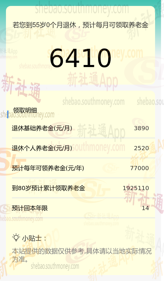 每月可领养老金总额:将基础养老金与个人养老金相加,每月可领取的养老金总额约为6410元(3890元+2520元)。