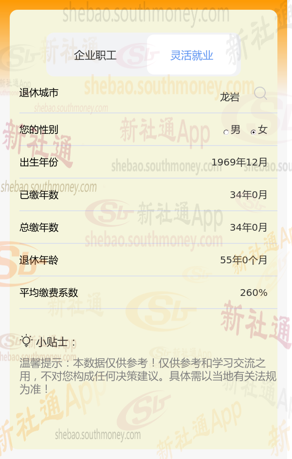 以龙岩1969年女性朱某为例,假设其按最低标准(缴费系数0.6)缴纳社保,新社通app养老金计算器预设工资增长率等参数为3%。在此情境下,其退休后能领取的养老金数额需通过计算器精确得出,但基于上述条件,预计数额会相对较低。为获准确估算,建议朱某使用计算工具按要求输入个人信息进行计算,具体数额依个人情况及当地法规而定。