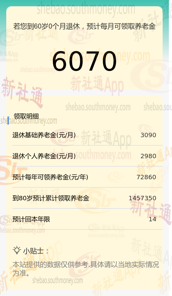 结果显示:他每月可以从个人账户中领取约2980元的养老金。将上述两部分相加,我们得出秦某每月预计可以领取的养老金总额为6070元。这一结果是由新社通app养老金计算器基于给定的参数和公式得出的估算值。