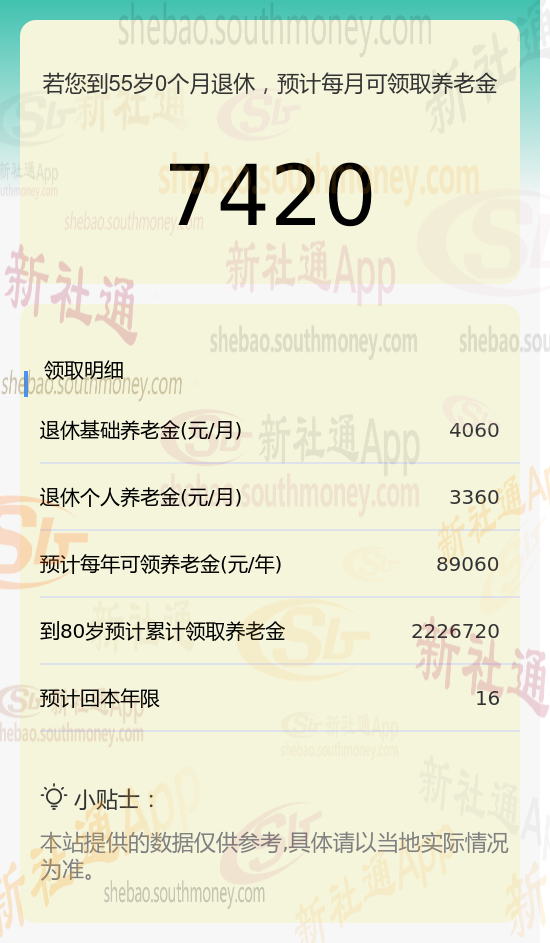 王某,退休地晋城,出生于1969年,工龄31年,女性,缴费按280%档次。岁月流转,她终于迎来了自己的退休年龄。根据新社通app养老金在线计算器计算所得:
