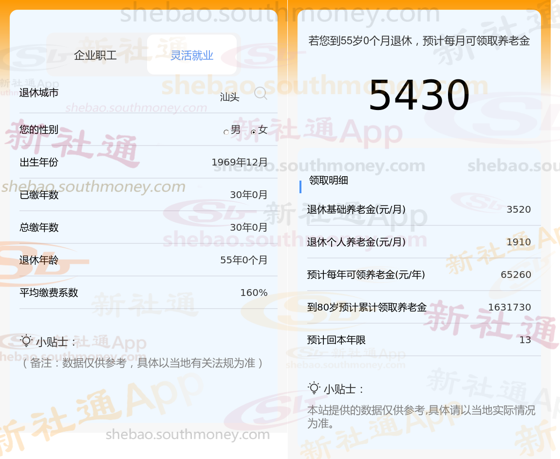 社保按160%档次缴费的秦某,汕头城市退休,出生于1969年,工龄30年,女性。岁月流转,她终于迎来了自己的退休年龄。根据新社通app养老金在线计算器计算所得: