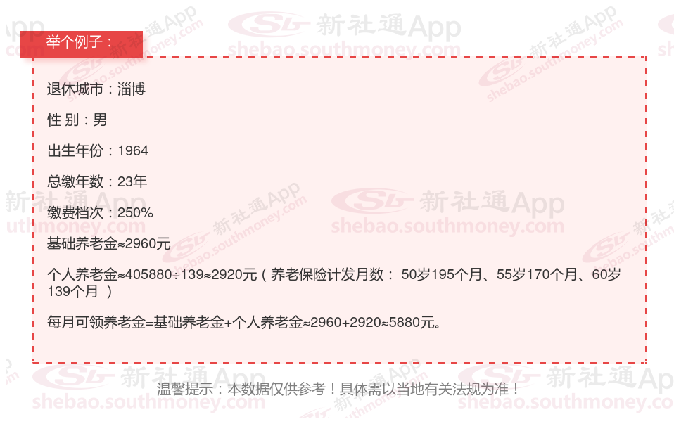 退休城市:淄博,性别:男,出生年份:1964,总缴年数23年,缴费档次:250%,新社通app养老金计算器所得: