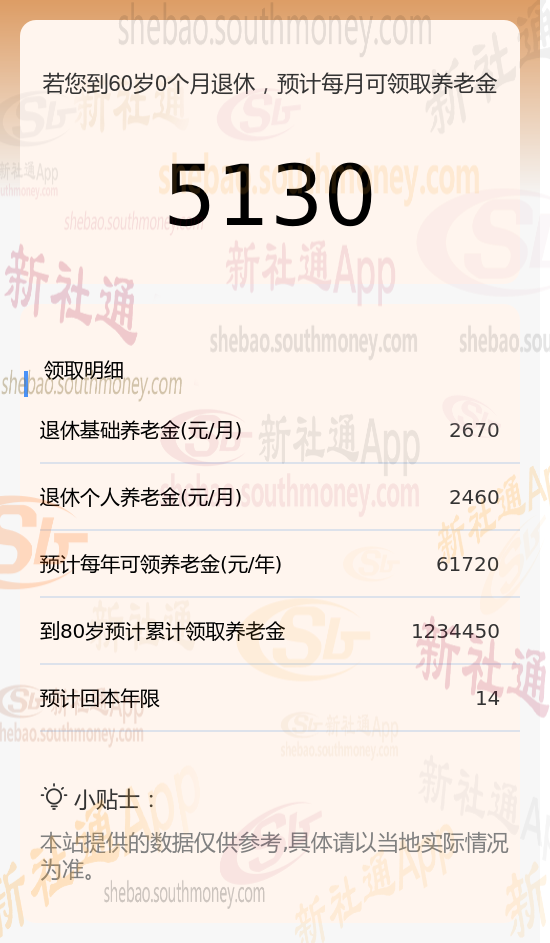 总养老金金额:两者合计,您每月可领取的养老金待遇总额为5130元/月。