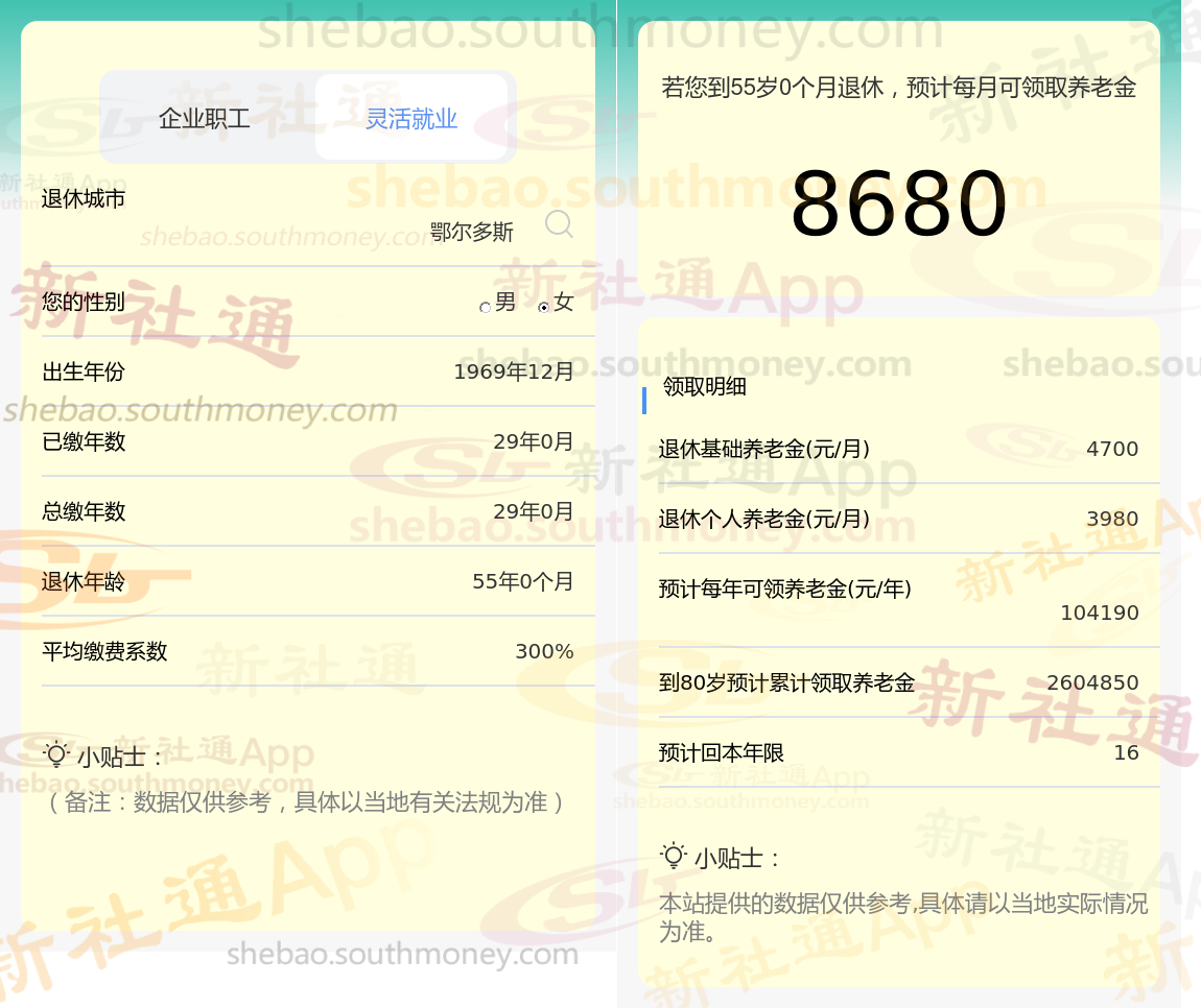 过渡性养老金=(上一年鄂尔多斯在岗职工月平均工资+上一年鄂尔多斯在岗职工月平均工资×个人平均缴费工资指数)÷2×1995年12月31日以前未建立个人账户的累积缴费年限×1.3%。