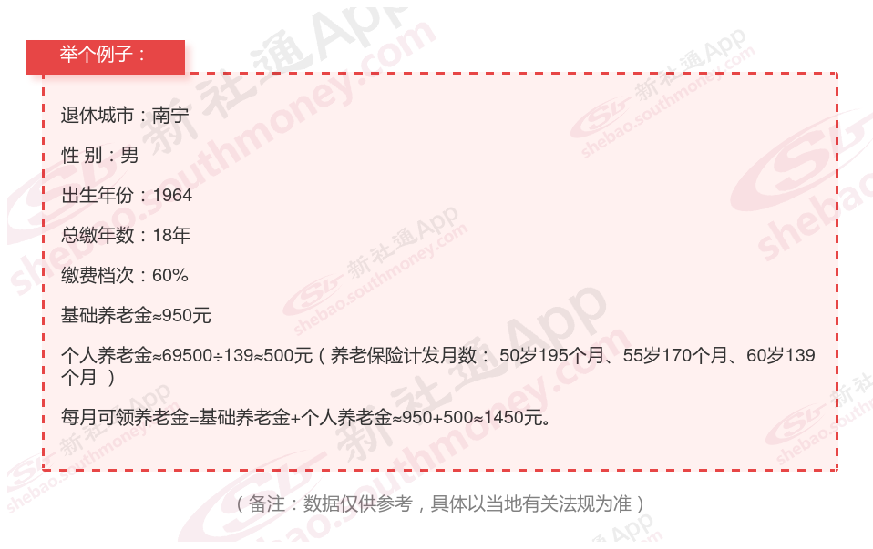 退休城市:南宁,性别:男,出生年份:1964,总缴年数18年,缴费档次:60%,新社通app养老金计算器所得: