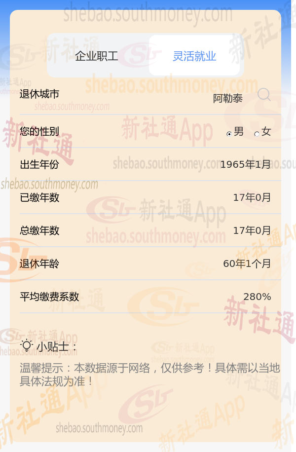 以阿勒泰为例,沈某1965年出生的男性,其社保缴费档次为280%。但在此,新社丫丫假设一个不同情境:若沈某一直按最低标准(即缴费系数为0.6)缴纳社保,并考虑到新社丫丫养老金计算器为了简化计算,将工资增长率、个人账户记账利率以及未来工资增长率均预设为3%。