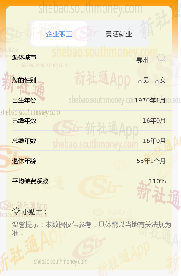 网友夏某退休城市在鄂州,性别:女,出生年份:1970为例,假设其按最低标准(缴费系数0.6)缴纳社保,新社通app养老金计算器预设工资增长率等参数为3%。在此情境下,其退休后能领取的养老金数额需通过计算器精确得出,但基于上述条件,预计数额会相对较低。为获准确估算,建议夏某使用计算工具按要求输入个人信息进行计算,具体数额依个人情况及当地法规而定。
