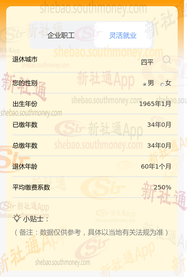 以四平1965年男性张某为例,假设其社保缴费档次为250%缴纳社保,新社通APP养老金计算器预设工资增长率等参数为3%。在此情境下,其退休后能领取的养老金数额可以通过计算器测算得出,但基于上述条件,预计数额会相对较低。为获相对准的测算结果,建议他使用新社通app养老金计算器输入个人信息进行计算,具体数额依个人情况及当地法规而定。