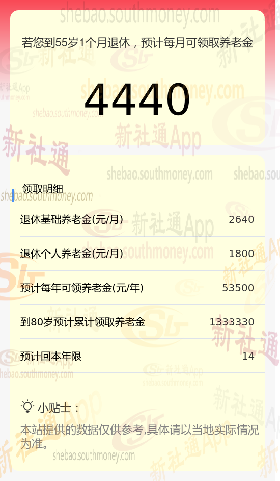 每月可领养老金总额:将基础养老金与个人养老金相加,每月可领取的养老金总额约为4440元(2640元+1800元)。
