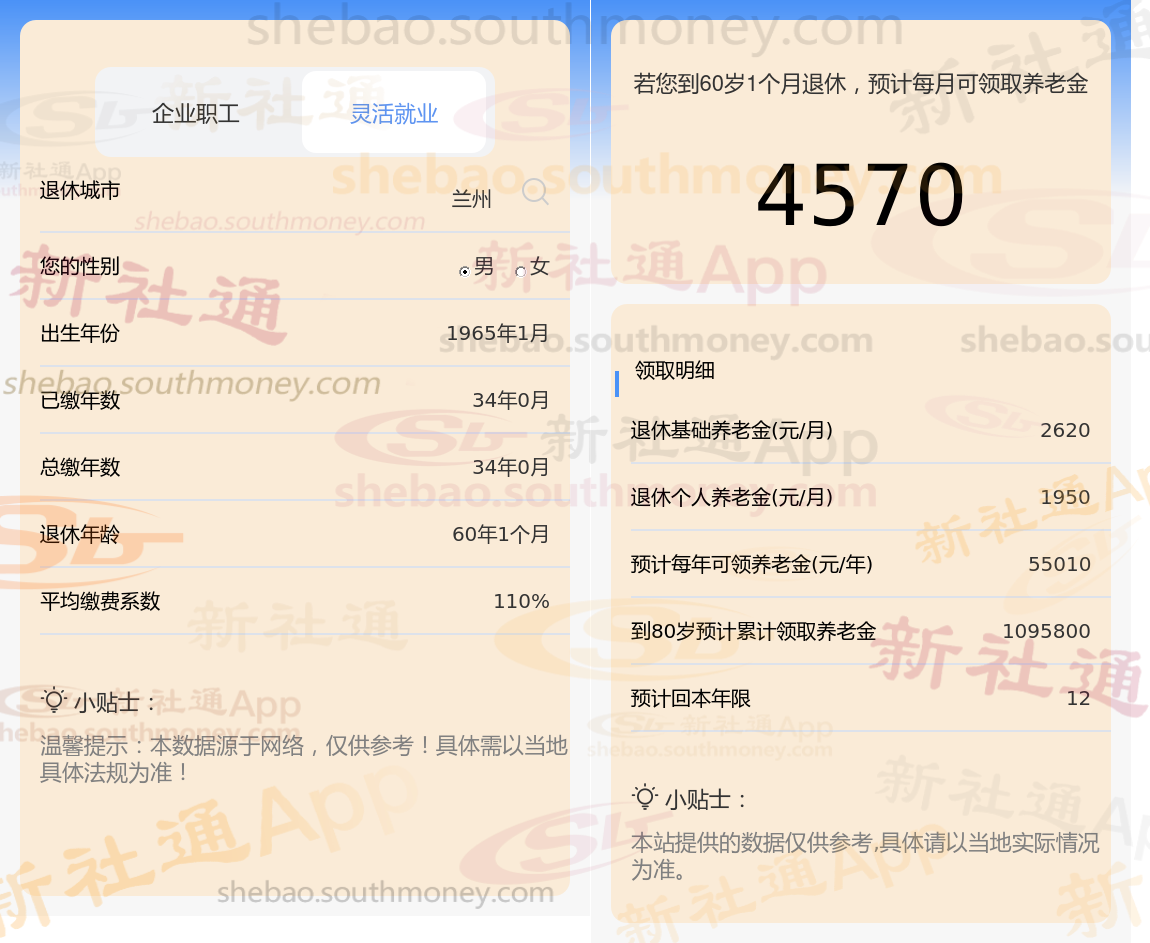 退休城市:兰州,性别:男,出生年份:1965,总缴年数34年,缴费档次:110%,新社通app养老金计算器所得: