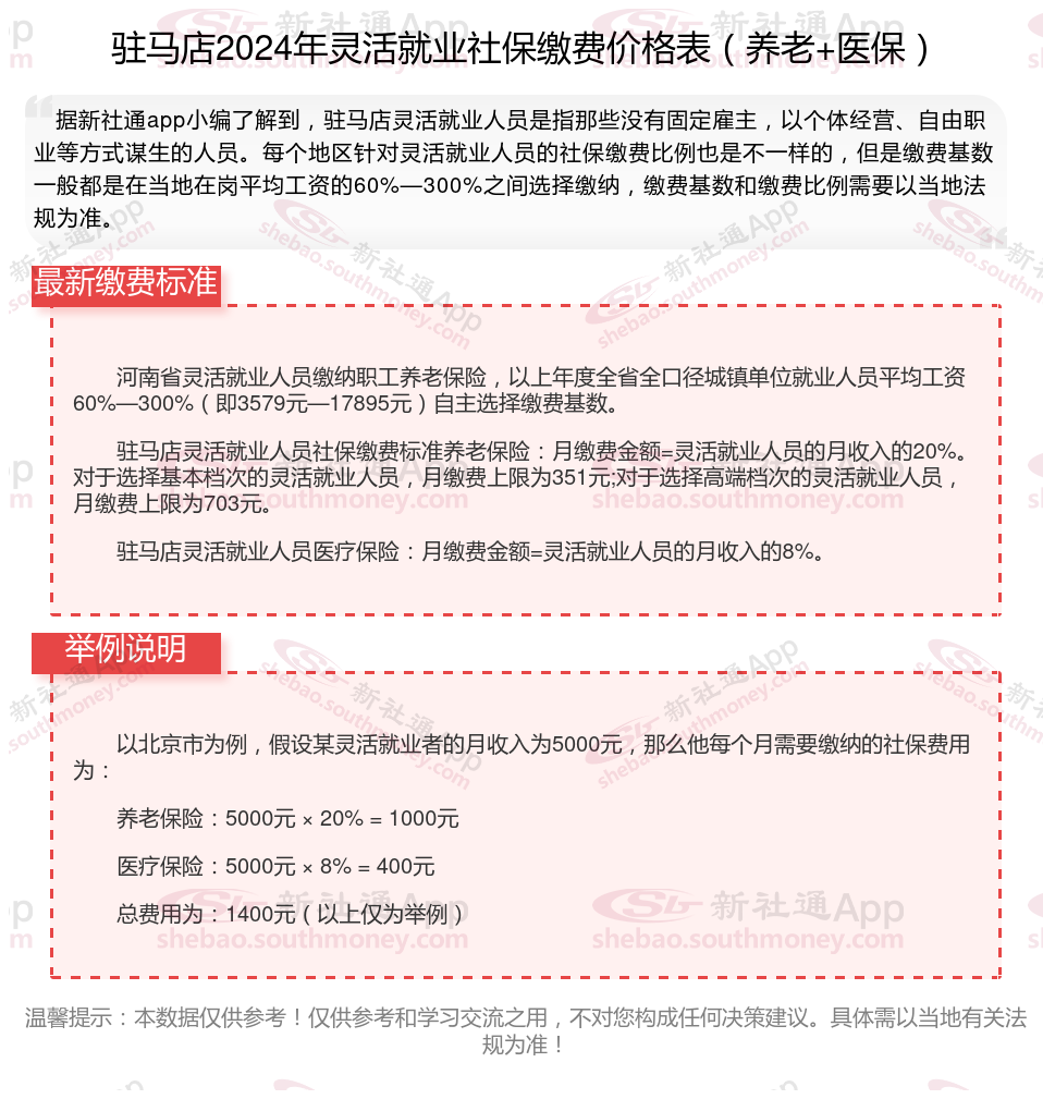 驻马店社保缴费多少钱?下表是2024-2025年驻马店社保费用明细参考,根据新社通app-社保缴费查询工具提供的最新数据如下: