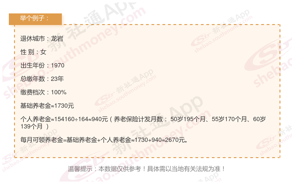 退休城市:龙岩,性别:女,出生年份:1970,总缴年数23年,缴费档次:100%