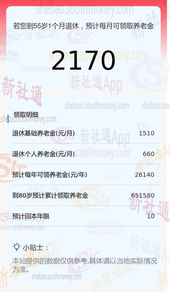 每月可领养老金总额:将基础养老金与个人养老金相加,每月可领取的养老金总额约为2170元(1510元+660元)。