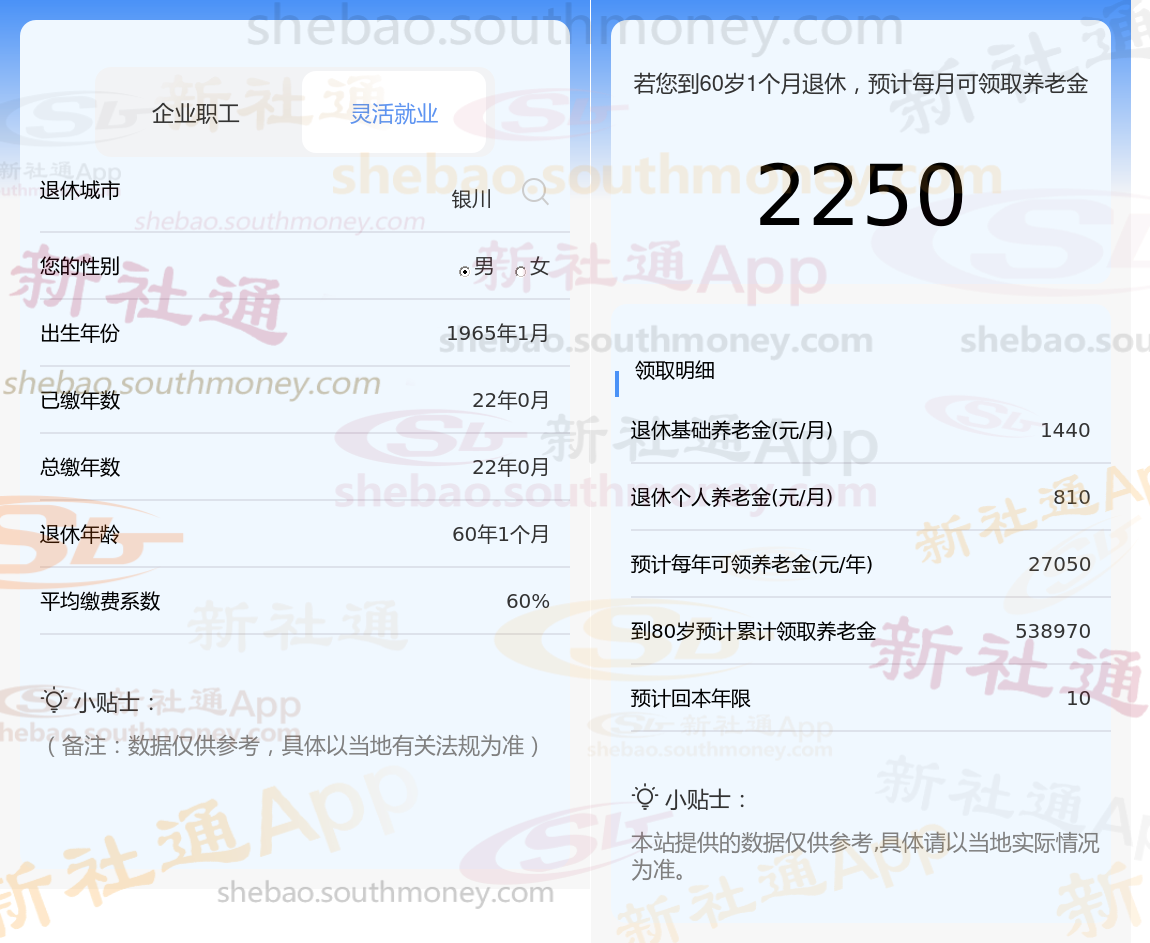 朋友沈某退休城市在银川,性别:男,出生年份:1965,总缴年数22年,缴费档次:60%,新社通app养老金计算器所得: