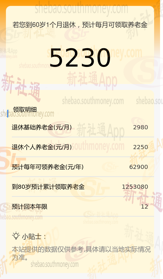 将基础养老金与个人养老金相加,我们得出每月可领取的养老金总额大约为5230元,即2980元(基础养老金)+ 2250元(个人养老金)。这个数字确定了退休后每月可以获得的稳定养老金收入。