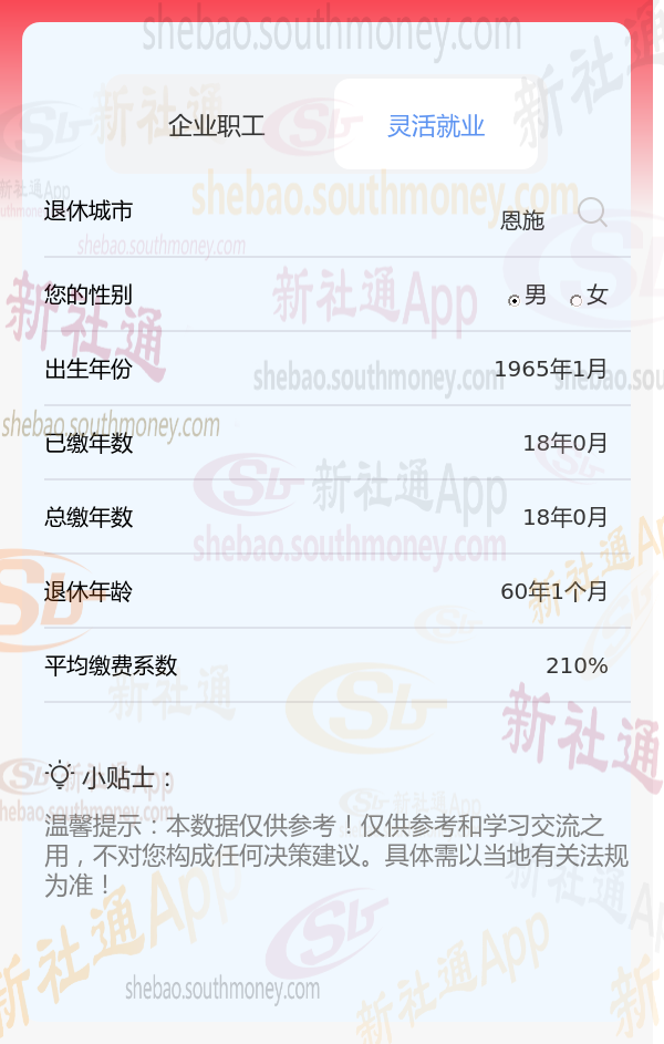 退休城市:恩施,性别:男,出生年份:1965,总缴年数18年,缴费档次:210%