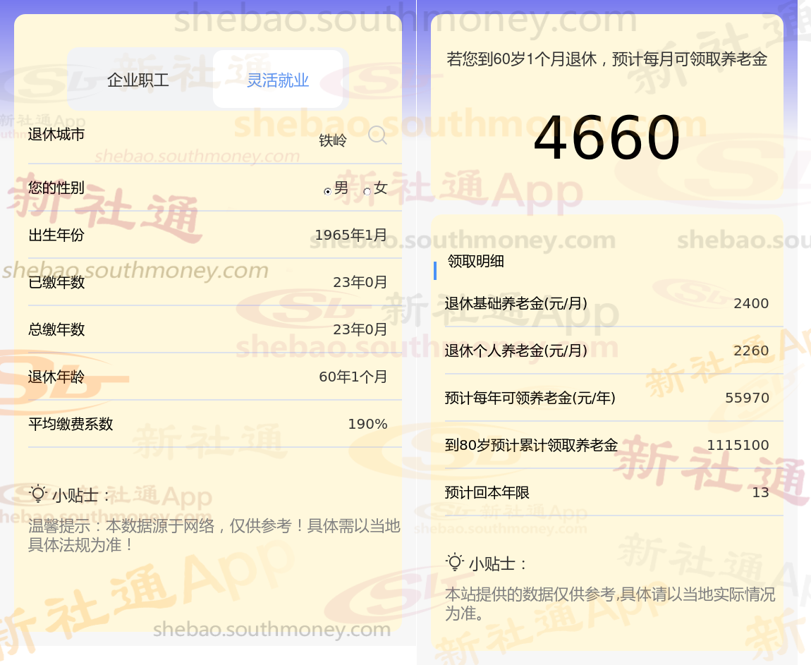 退休城市:铁岭,性别:男,出生年份:1965,总缴年数23年,缴费档次:190%,新社通app养老金计算器所得: