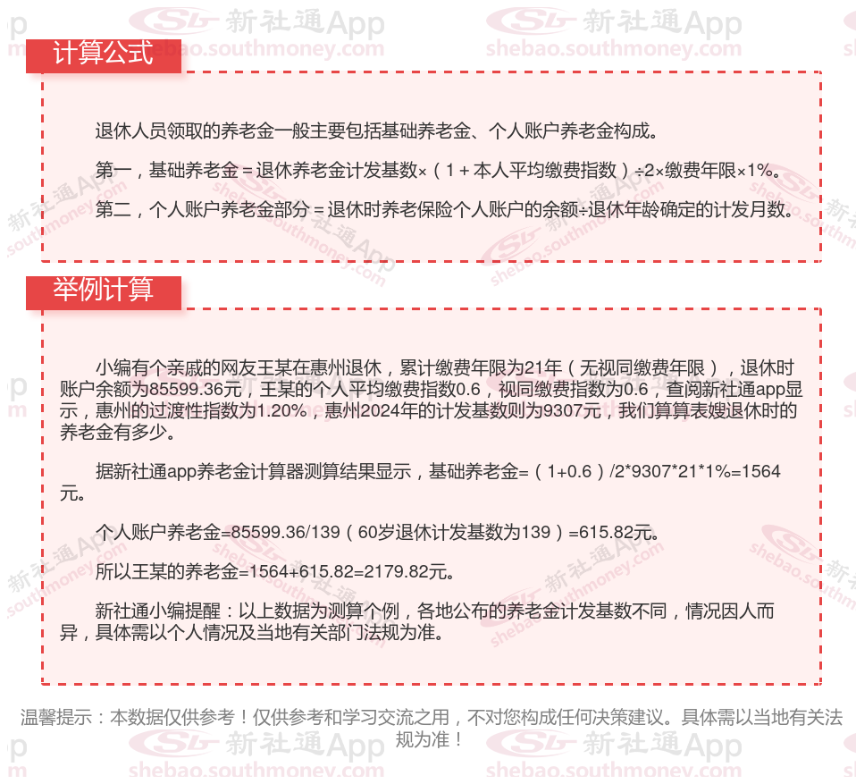 基本养老金=基础养老金+个人账户养老金+过渡性养老金=退休前一年全市职工月平均工资×20%(缴费年限不满15年的按15%)+个人账户本息和÷120+指数化月平均缴费工资×1997年底前缴费年限×1.4%。