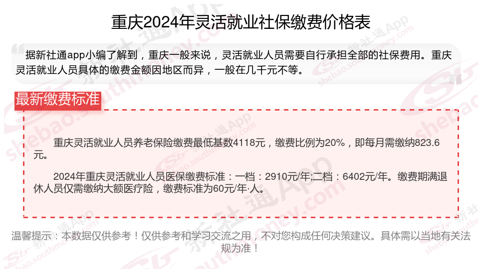 重庆灵活就业自己交社保一个月要交多少钱?根据新社通app-社保缴费查询工具提供的最新数据如下: