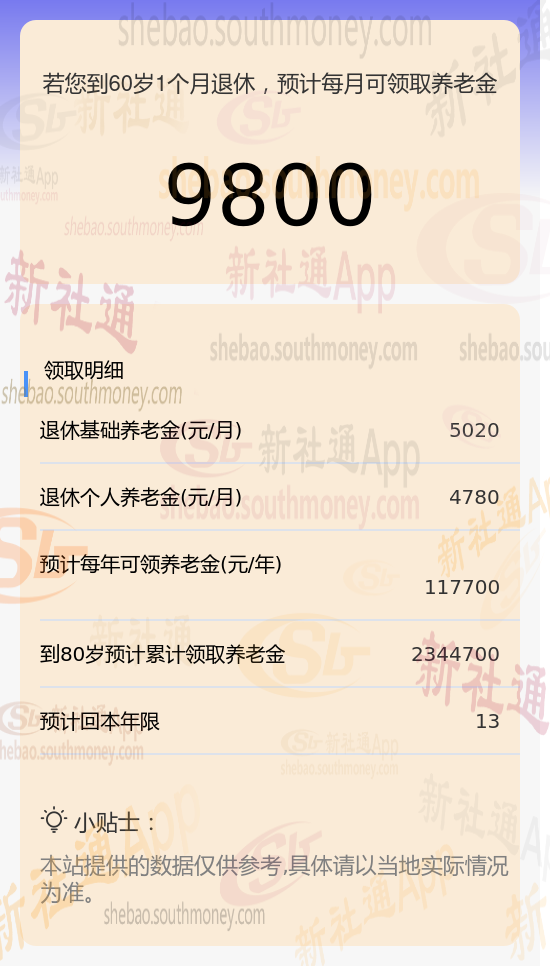 根据新社通app养老金计算器的估算: