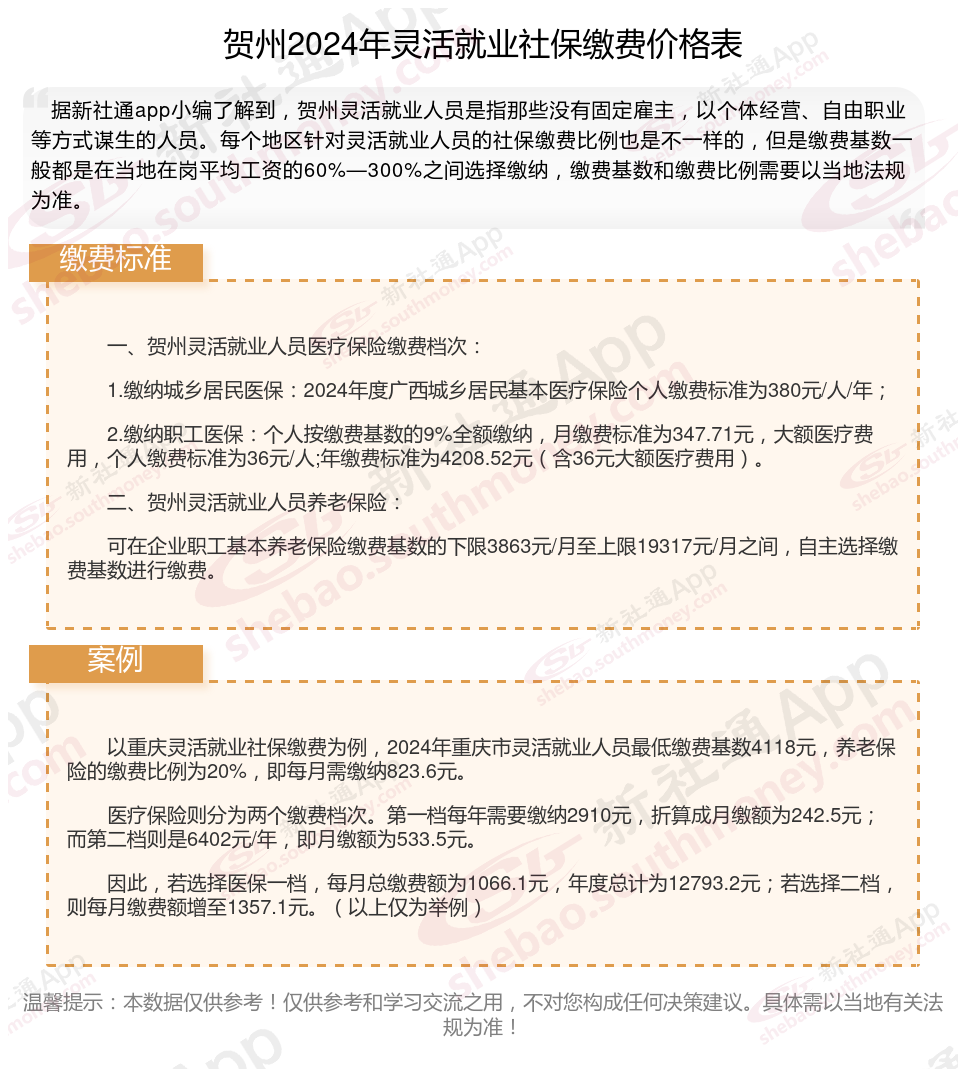 据新社通app数据显示,贺州灵活就业人员养老保险缴费基数2024-2025年最新标准如下:
